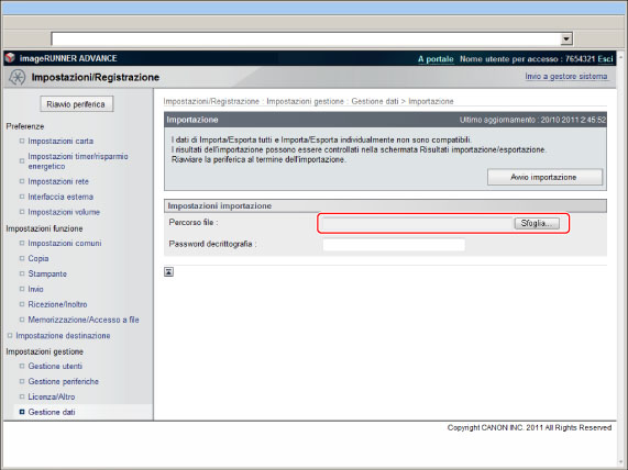 Per abilitare le impostazioni importate è necessario riavviare la macchina. Dopo l'importazione, non sarà possibile utilizzare l'IU remota per eseguire altre operazioni sino al riavvio della macchina. Spegnere e riaccendere la macchina con l'interruttore principale. (Vedere "Alimentazione principale e tasto risparmio energetico".)