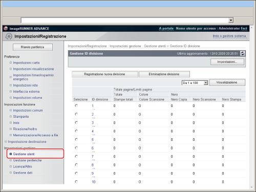 Le impostazioni di Gestione ID divisione sono uguali a quelle cui è possibile accedere dal pannello comandi premendo [Gestione utenti] → [Impostazioni/Registrazione] → [Gestione ID divisione]. Per istruzioni sull'utilizzo del pannello comandi per specificare le impostazioni di Gestione ID divisione e per ulteriori informazioni su Gestione ID divisione, vedere "Gestione ID divisione".