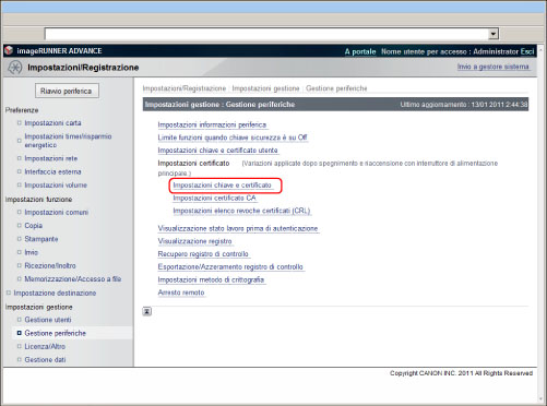 Fare clic su [Impostazioni chiave e certificato] → [Registrazione chiave e certificato] → [Installazione...].
