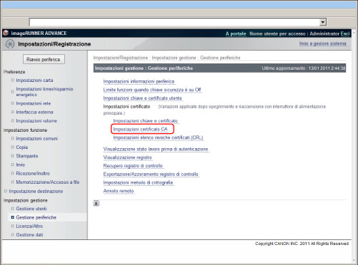 Questa funzione consente di registrare/controllare/eliminare un elenco delle revoche dei certificati (CRL).