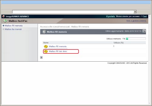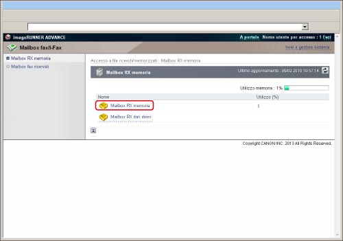 Fare clic su [Accesso a file ricevuti/memorizzati] → [Mailbox RX memoria] → [Mailbox RX memoria].