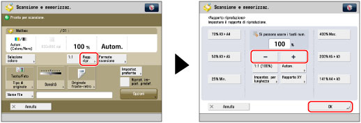È possibile ingrandire o ridurre gli originali con un rapporto di zoom ad incrementi dell'1%. I rapporti di zoom disponibili vanno dal 25% al 400% per la funzione Mailbox e dal 50% al 200% per la funzione Area di condivisione, Rete o Supporto memoria. Viene utilizzato lo stesso rapporto di zoom per gli assi orizzontale e verticale.