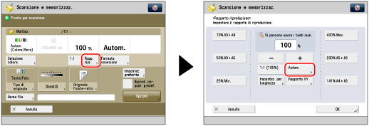 Questo modo consente alla macchina di selezionare automaticamente il rapporto di zoom in base al formato di registrazione selezionato. I rapporti di zoom disponibili vanno dal 25% al 400% per la funzione Mailbox e dal 50% al 200% per la funzione Area di condivisione, Rete o Supporto memoria. Viene utilizzato lo stesso rapporto di zoom per gli assi orizzontale e verticale.