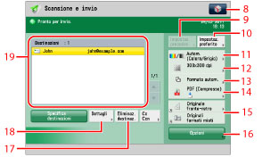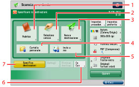 Premere questo tasto per selezionare e utilizzare altre modalità di scansione e invio disponibili. Impostare la funzione di fax più utile, quale l'invio congiunto di originali di diverso formato o l'invio di originali fronte-retro.