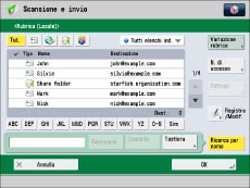 (e-mail), (fax), (I-fax), (file) o (gruppo) vengono visualizzate le destinazioni relative al tipo selezionato. |