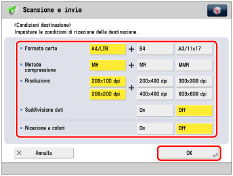 Impostare le condizioni per la destinazione in base alle specifiche della macchina di destinazione. Se si impostano condizioni non supportate dalla macchina del destinatario potrebbe verificarsi un errore di trasmissione.