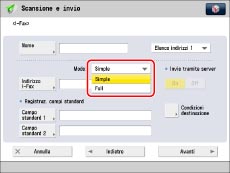 Se non si devono inviare documenti tramite server e l'indirizzo IP del destinatario non è registrato con un server DNS, immettere il nome di dominio nel seguente formato: (utente)@(indirizzo IP del destinatario).