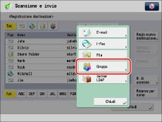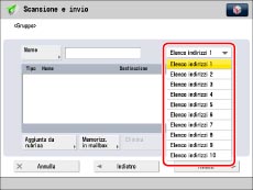 La funzione Indirizzo di gruppo consente di creare un gruppo. In un singolo gruppo è possibile registrare diversi tipi di destinazioni (come ad esempio e-mail, I-fax, file server o mailbox).