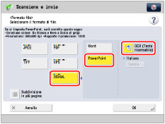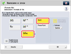 Se si seleziona il formato file PDF o XPS, è possibile impostare [Compresso] e [OCR (Testo ricercabile)] contemporaneamente. In questo caso, nella schermata Funzioni di base Scansione e invio come formato del file viene visualizzato [PDF (Compresso)] o [XPS(Compresso)].