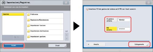 Per default, le impostazioni del gestore del sistema (ID gestore sistema/PIN sistema) sono impostate sulla macchina. Pertanto, l'amministratore deve collegarsi immettendo l'ID del gestore del sistema e il PIN di sistema. L'impostazione predefinita per ID gestore sistema e PIN sistema è '7654321'. Si consiglia di modificare sia l'ID del gestore del sistema sia il PIN di sistema.