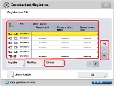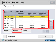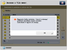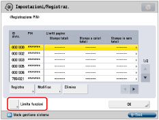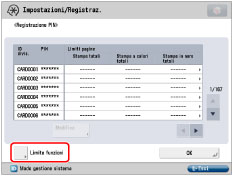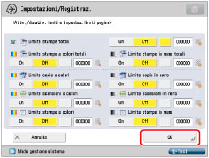 .Il limite al numero di pagine che possono essere generate può essere impostato tra 0 e 999.999 pagine. Una volta raggiunto il limite delle pagine, non è possibile continuare con la copiatura, la scansione o la stampa.