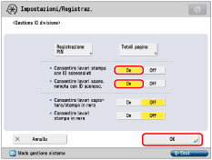 Impostare <Consentire lavori stampa con ID sconosciuti> su 'Off' per rifiutare tutti i lavori di stampa da driver di stampa che non supportano la Gestione ID divisione.