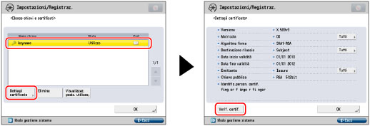 Le coppie di chiavi per cui 'Utilizzo' viene visualizzato in <Stato> non possono essere eliminate perché sono in uso con l'autenticazione IEEE802.1X/con IPSec o perché SSL è impostato su 'On'. Premere [Visualizzaz. posiz. utilizzo] per controllare il tipo di protezione per cui è utilizzata la coppia di chiavi. Per eliminare una coppia di chiavi utilizzata solo con SSL, specificare le seguenti impostazioni su 'Off'. Una coppia di chiavi utilizzata per l'autenticazione IEEE802.1X/per IPSec non può essere eliminata.