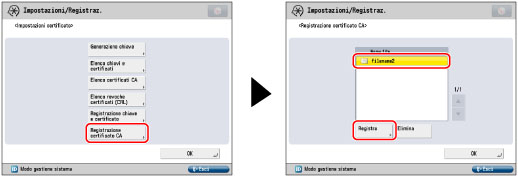 Premere [Registrazione certificato CA] → selezionare il nome del file → premere [Registra].