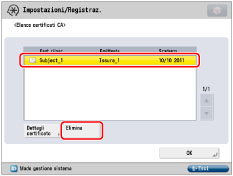 Selezionare il certificato CA da eliminare → premere [Elimina].