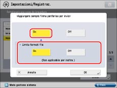 Premere [Aggiungere sempre firma periferica per invio] → [On] per <Aggiungere sempre firma periferica per invio> → specificare l'impostazione per <Limite formati file>.