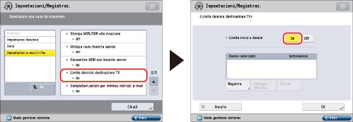 Si possono impostare delle restrizioni relative ai domini a cui è possibile inviare documenti e-mail o I-fax. Se si impostano dei limiti ai domini a cui è possibile trasmettere, si potranno inviare documenti solo alle destinazioni che appartengono ai domini specificati.