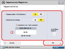 Selezionare [On] per stampare automaticamente il Rapporto attività dopo che sono state effettuate 40 trasmissioni/ricezioni.