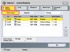Visualizza informazioni dettagliate sul lavoro selezionato. Controllare le informazioni dettagliate → premere [OK] per tornare alla schermata Copia/Stampa.