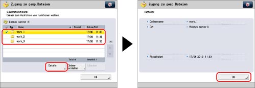 Wählen Sie den gewünschten Ordner → Berühren Sie die Taste [Details] → Bestätigen Sie durch Berühren der Taste [OK].
