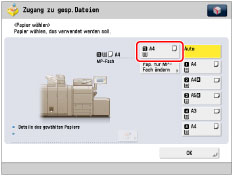 Wenn für den aktuellen Auftrag Papier über das Mehrzweckfach zugeführt wird, können Sie das Papier für den nächsten Auftrag über [Pap. für MP-Fach ändern] auswählen. (Vgl. Abschnitt "Reservieren eines Druckauftrags mit dem Mehrzweckfach".)