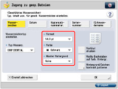 Text, den Sie unter [Anwenderdefin.] eingeben, wird nicht automatisch gespeichert. Wenn Sie das neu erzeugte geschützte Wasserzeichen speichern möchten, um es aufzurufen, wenn Sie es benötigen, berühren Sie die Taste [Speichern] → Geben Sie den zu speichernden Text ein.