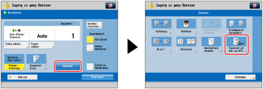 Berühren Sie nacheinander die Tasten [Optionen] → [Passwort um Dok. zu öffn.].