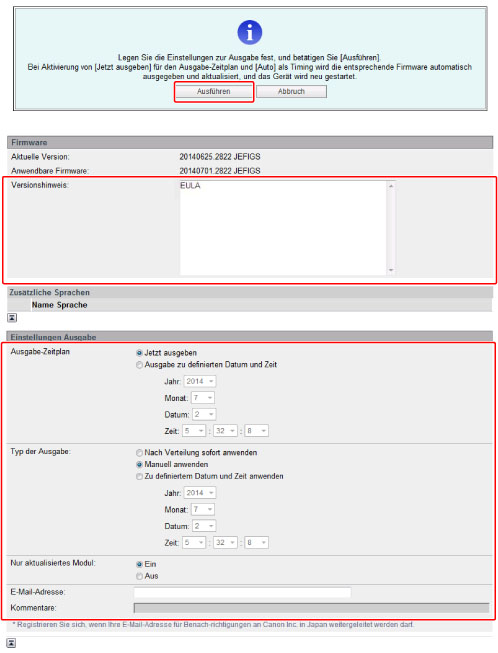 [Jetzt ausgeben]: Lädt die Firmware nach Angabe der Ausgabeeinstellung herunter.