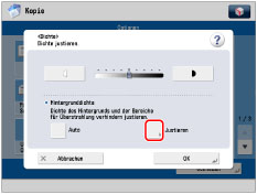 Wenn Sie die Hintergrunddichte durch Drücken von [Justieren] für <Hintergrunddichte> justieren möchten, wird die Einstellung [Auto] aufgehoben. Entsprechend werden beim Drücken von [Auto] beim Vornehmen manueller Einstellungen in [Justieren] Ihre Einstellungen aufgehoben. Das System justiert automatisch die Dichte entsprechend dem Hintergrund.