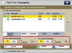 Wenn Sie <Fax Speicherempfang> und/oder <I-Fax Speicherempfang> deaktivieren, werden Dateien, die per Fax/I-Fax empfangen wurden, automatisch gedruckt und aus der Box Speicherempfang gelöscht.