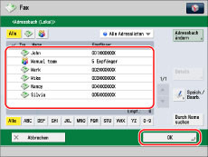 ein. Wenn Sie die Taste [Adressen ohne Zugangsnummer] berühren, werden die Empfänger angezeigt, die nicht per Zugangsnummer verwaltet werden.|