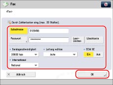 Berühren Sie die Taste [Details einstellen], wenn Sie Subadresse, Passwort, ECM SE, Sendegeschwindigkeit und International einstellen wollen. Wenn das System für mehrere Leitungen eingerichtet ist, können Sie auch die Leitung wählen, die zum Senden verwendet werden soll.