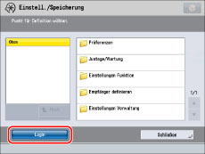 Einige Elemente auf dem Display <Einstellungen/Speicherung> können für allgemeine Anwender eingeschränkt sein. Elemente, für die ein Anwender nicht die erforderlichen Nutzungsrechte besitzt, werden auf dem Sensordisplay grau angezeigt und können nicht gewählt werden. Elemente, für die ein Anwender nicht die erforderlichen Nutzungsrechte besitzt, werden auf dem Remote UI nicht angezeigt.
