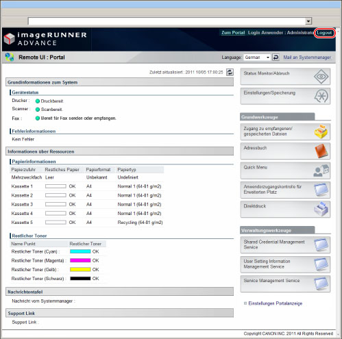 Wenn Sie den Vorgang abgeschlossen haben, berühren Sie die Taste [Logout] oder betätigen die Taste