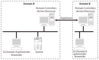 Anwender, die zu Domain A gehören (in der sich das System befindet), und Anwender, die zu Domain B gehören (die von Domain A bidirektional zugelassen ist), können authentisiert werden. Außerdem können Anwender authentisiert werden, die in der Einheit selbst gespeichert sind. Der Anwender wählt die Position zum Anmelden (Domänenname oder [Dies System]) beim Anmelden.