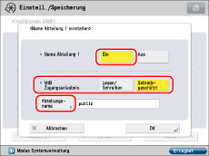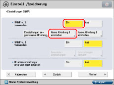 Berühren Sie [Ein] für <SNMP v. 1 verwenden> → [Einstellungen zugewiesene Abteilung]. Berühren Sie [Ein] für <Zugewiesene Abteilung> → [Lesen/Schreiben] für <Zulassung MIB Zugang>.
