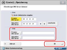 Berühren Sie [Einstellungen Adresse DNS-Server] für [Einstellungen DNS] → Legen Sie die folgenden Elemente in <IPv6> fest → Berühren Sie [OK].