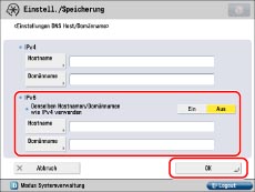 Berühren Sie [Einstellungen DNS Host/Domänname] für [Einstellungen DNS] → Legen Sie die folgenden Elemente in <IPv6> fest → Berühren Sie [OK].