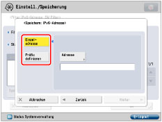 So definieren Sie eine einzelne IPv6-Adresse: Berühren Sie [Einzeladresse] → [Adresse]. Geben Sie eine IPv6-Adresse ein → Berühren Sie [OK].