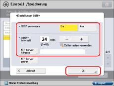 Berühren Sie [Einstellungen SNTP] für [Einstellungen TCP/IP] → Legen Sie die folgenden Optionen fest → Berühren Sie [OK].