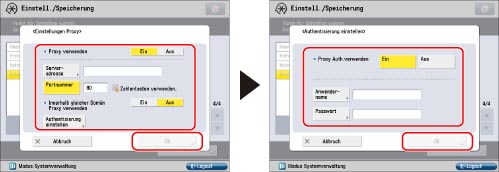 Wenn Sie die Proxy-Authentisierung verwenden möchten, berühren Sie [Authentisierung einstellen] → Berühren Sie [Ein] für <Proxy-Auth.verwenden>. Berühren Sie [Anwendername] → Geben Sie den Anwendernamen für die Proxy-Authentisierung ein → Berühren Sie [OK]. Berühren Sie [Passwort] → Geben Sie das Passwort für die Proxy-Authentisierung ein → Berühren Sie [OK]. Geben Sie zur Bestätigung dasselbe Passwort ein → berühren Sie [OK].