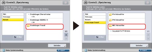 Berühren Sie [Einstellungen Firewall] für [Netzwerk] → [Filter MAC-Adresse].