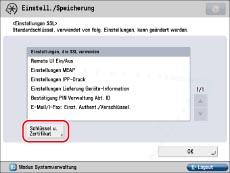 Berühren Sie [Einstellungen SSL] für [Einstellungen TCP/IP] → [Schlüssel und Zertifikat].