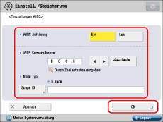 Berühren Sie [Einstellungen WINS] für [Einstellungen TCP/IP] → Legen Sie die folgenden Optionen fest → Berühren Sie [OK].