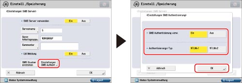 Berühren Sie [Einstellungen SMB-Auth.] → Legen Sie die SMB-Authentisierungseinstellungen fest → Berühren Sie [OK].
