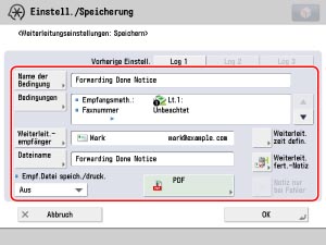 → [Einstellungen Funktion] → [Empfangen/Weiterleiten] → [Allgemeine Einstellungen] → [Einstellungen Weiterleitung] → [Speichern]→ Legen Sie jede Einstellung fest.
