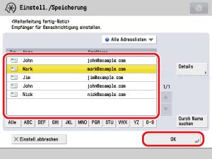 Es kann nur ein Empfänger für eine Weiterleitung fertig-Notiz gewählt werden. Zum Senden an mehrere Empfänger müssen diese in einer Gruppenadresse zusammengefasst gespeichert werden.