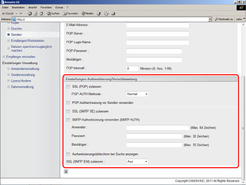 Wenn der SMTP-Server keine Verschlüsselung unterstützt, werden die Daten bei auch bei Aktivierung von <SSL (SMTP SE) zulassen> nicht verschlüsselt.