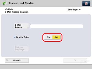 Legen Sie ein maximales Datenformat zum Senden fest, das unter dem Grenzwert für den Mail-Server liegt. Legen Sie '0 MB' als Datengröße fest, gibt es keine Beschränkung für das Senden der Daten. |