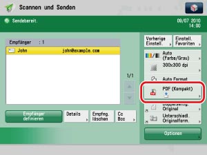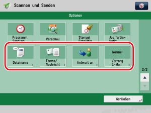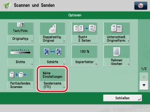 Sie können nur die im Voraus für "Sendername" und "Antwort an" gespeicherten Einstellungen wählen. Auf dem Display Optionen ist die Eingabe eines neuen Empfängers nicht möglich. Speichern Sie den Empfänger in Einstellungen/Speicherung. Der am Empfangsbildschirm angezeigte "Sendername" ist der Gerätename des sendenden imageRUNNER ADVANCE-Systems und nicht der eingestellte "Sendername".